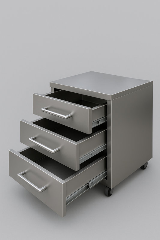 目标产品为不锈钢医用抽屉,规格为三层抽屉柜(如图所示),带滚轮,尺寸约400mm(长)×300mm(宽)×500mm(高),材质为304不锈钢(厚度1.2mm),表面需拉丝处理,满足医疗环境的高洁净要求。订单量为196万件,单价101元,总金额约1.98亿元。鑫捷联盟利用佛山、珠海、深圳等工厂的协同生产体系,充分发挥设备优势和规模效应,确保项目高效落地。