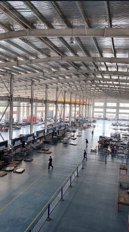 图中厂房采用大跨度钢结构设计,屋顶覆有高反射性的隔热保温材料,有效应对南方高温潮湿的气候。这种结构既保证了通风采光,又提供了足够的吊装高度,满足大型钣金件的吊运与装配需求。天花板整齐排列的照明灯具与消防喷淋系统,体现出该厂对安全与生产双重保障的重视。