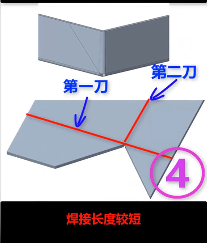 图中展示了一个钣金折弯件,板材经过折弯后形成直角结构,标注为“第一刀”的折弯线表明这是第一次折弯的区域。折弯后,两块板材在边缘处需要焊接以固定结构。图中标注的“4”表示焊接长度为4mm,说明焊接并非全长,而是采用间断焊接的方式。