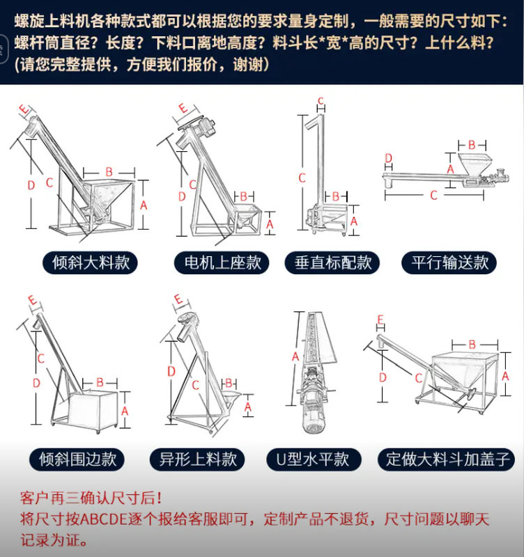 🔍 **特别提醒:**下单前请确认螺旋直径、料斗长宽高、上料高度、下料口离地距离、物料类型等关键数据,以便精确报价和结构设计。