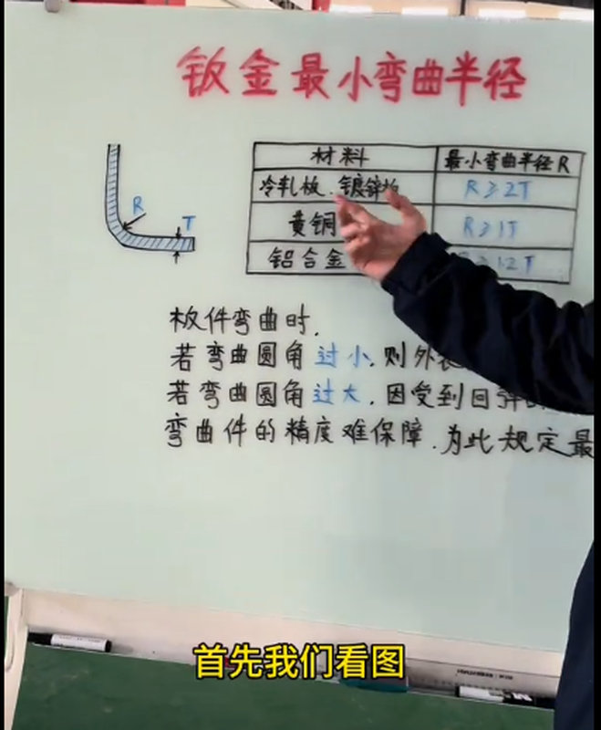 图片显示了一块白板,上面手绘了弯曲件的示意图,并列举了不同材料的最小弯曲半径规定,同时还解释了弯曲半径过大或过小可能带来的问题。