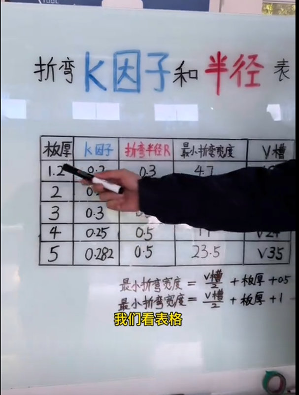 图片中的表格列出了不同板厚对应的K因子。K因子是钣金折弯理论中的一个重要概念,它表示弯曲变形过程中,中性层(即材料既不受拉伸也不受压缩的层)相对于板材厚度的位置。