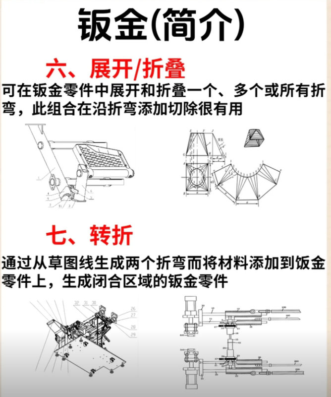 图片中“六、展开/折叠”部分直观展示了这一功能的强大之处:“可在钣金零件中展开和折叠一个、多个或所有折弯,此组合在沿折弯添加切除很有用。”