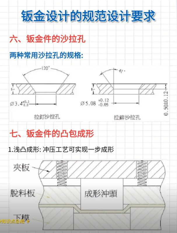 钣金设计中的沙拉孔和凸包成形是提升装配性、功能性和外观的关键工艺。规范的孔径、锥度角度及成形工艺选择,直接影响产品质量和制造成本。严格控制公差、优化模具设计是确保性能的关键。如需深入探讨材料选择或工艺细节,可进一步提问。