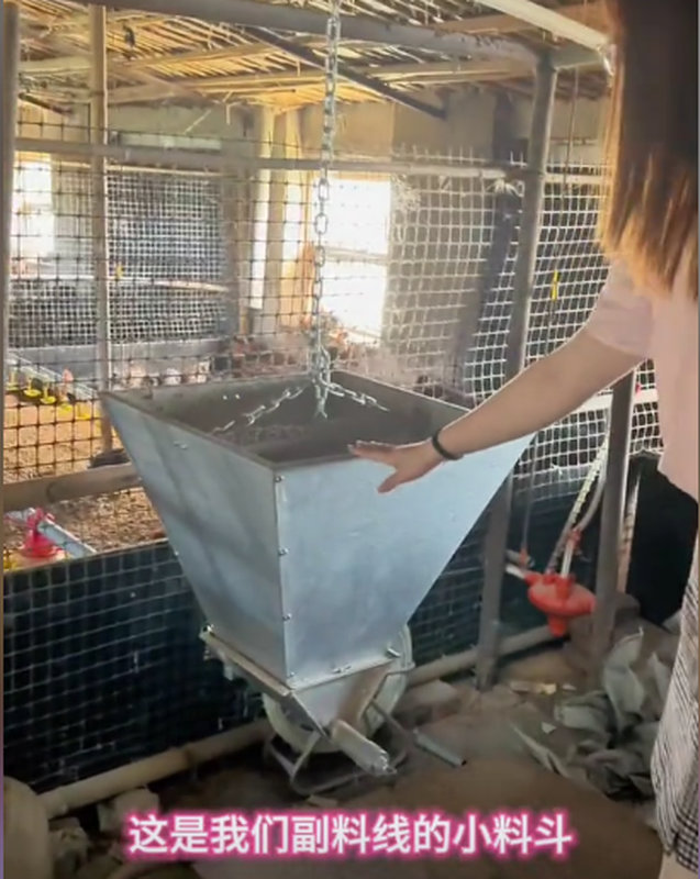 照片中,一位工作人员正在操作一台悬挂式提升机,设备由金属钣金制成,呈漏斗状,内部装有饲料,悬挂在鸡舍的铁笼上方。提升机的设计简洁实用,钣金外壳坚固耐用,能够承受饲料的重量和鸡舍环境的腐蚀性挑战。背景可见鸡笼和散落的饲料,显示这是一套自动化喂食系统的组成部分。标题提到“中山鑫捷鑫属”,表明这家企业(可能与我所在的鑫捷激光相关)是负责制造该设备钣金件的专业厂家。