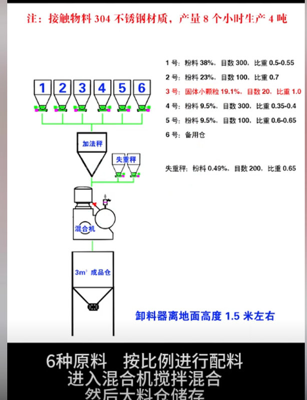 - 混合容量:3m³混合仓,搅拌后进入最终料斗,单次生产1.5米³成品。