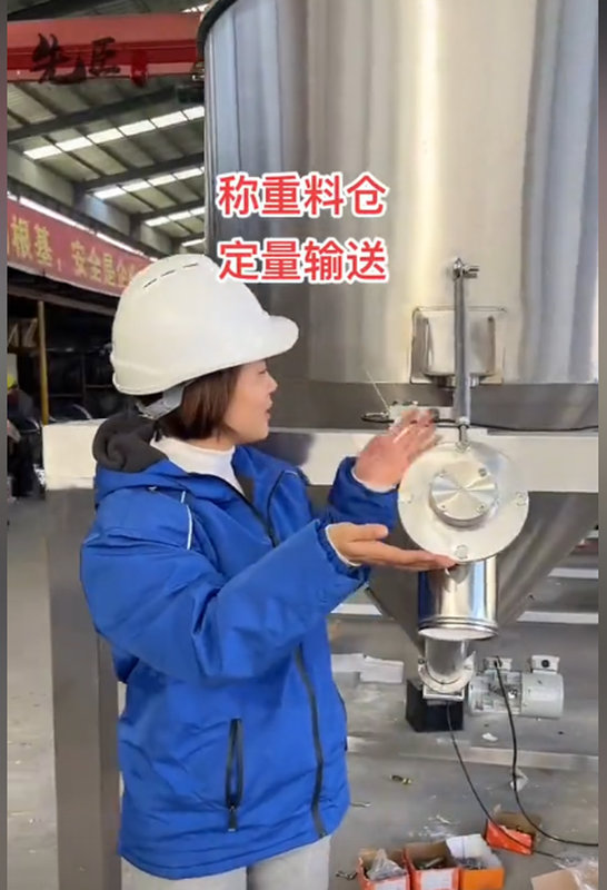 照片里这位戴着安全帽、穿着蓝色工服的大姐,是我们中山一家钣金加工厂的缩影。她脸上没有太多花哨的表情,眼神里透着一股子对自己手头活儿的自信和熟悉。她轻轻扶着的这个亮闪闪的大块头,叫“称重料仓”,旁边小字写着“定量输送”。