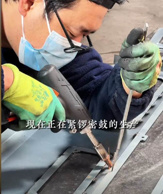 图片中展示的焊接场景,工人使用专业设备进行手工焊接,体现了精细操作和对细节的关注。这种工艺确保了焊缝的均匀性和耐用性,是高质量钣金产品的基础。