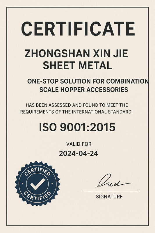 近日,中山鑫捷钣金加工厂正式通过国际权威机构的严格评审,获得 ISO 9001:2015质量管理体系认证证书。这一荣誉不仅标志着中山鑫捷在管理体系、生产工艺、品质管控上的全面升级,更进一步巩固了其在 组合秤厂家配件一站式服务领域的领先地位。