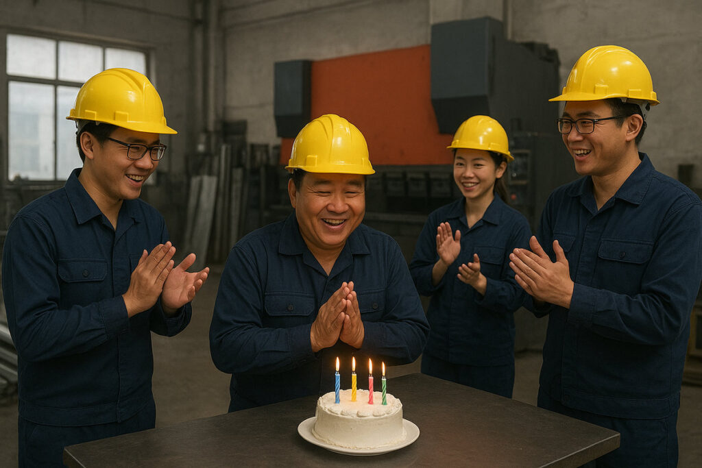 开料车间的日常通常紧张而专注,但在某个特别的日子里,工人们放下手中的工具,聚在一起,为同事庆生。简单的蛋糕、几声真诚的祝福,就让整个车间充满了温暖。