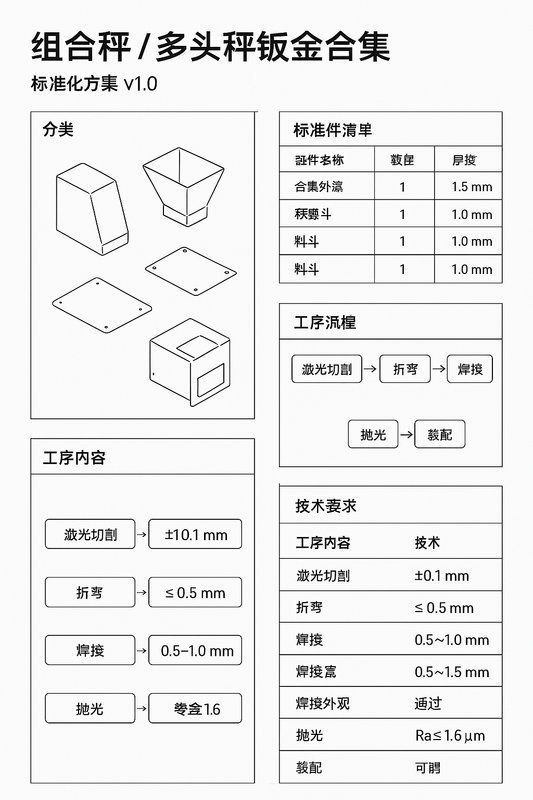 中山鑫捷钣金加工厂专注于组合秤 / 多头秤设备钣金件的定制加工十余年。随着客户需求的多样化与国际化发展,为提高产品一致性、缩短交付周期、降低生产成本,我司制定本《组合秤 / 多头秤钣金合集(标准化方案 v1.0)》。