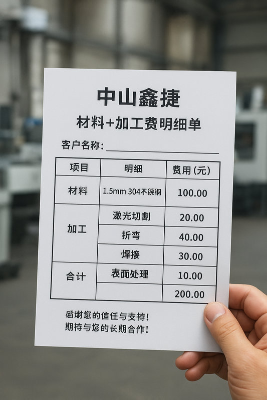 20年的钣金加工经验,让我们更清楚:客户要的不是虚头巴脑的客套,而是能落地的靠谱合作。中山鑫捷送给新客户的礼,不是烟茶,而是一份“材料+加工费明细单”。