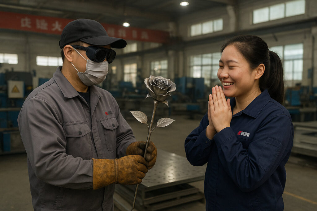 那天,激光师傅悄悄利用下班后的时间,把废料边角料精心打磨、切割,焊接成了一朵不锈钢304的玫瑰花。花瓣层层叠叠,线条优雅,经过打磨后闪耀着金属的柔和光泽。第二天,他把这朵玫瑰递给了在车间忙碌的质检女同事。
