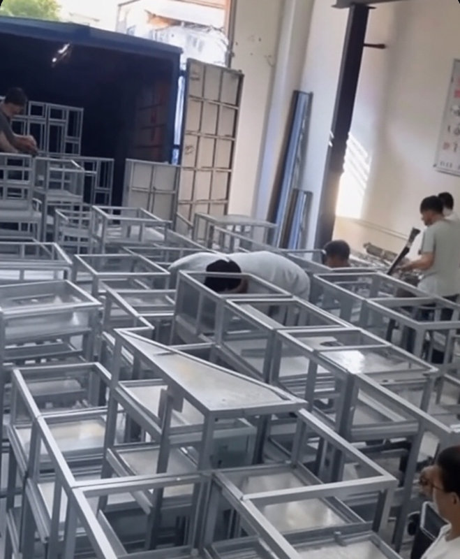 在宽广明亮的车间里,一批批不锈钢架子正被工人们有序地搬运、打包、装车。架子表面泛着金属光泽,在阳光和灯光的映照下,显得格外整齐与坚固。车间的空气里弥漫着工业的节奏感,机器的轰鸣、工人的呼喊声,汇聚成一首属于制造业的协奏曲。