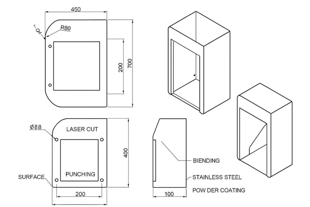 - 标明材料厚度、材质和表面处理要求。