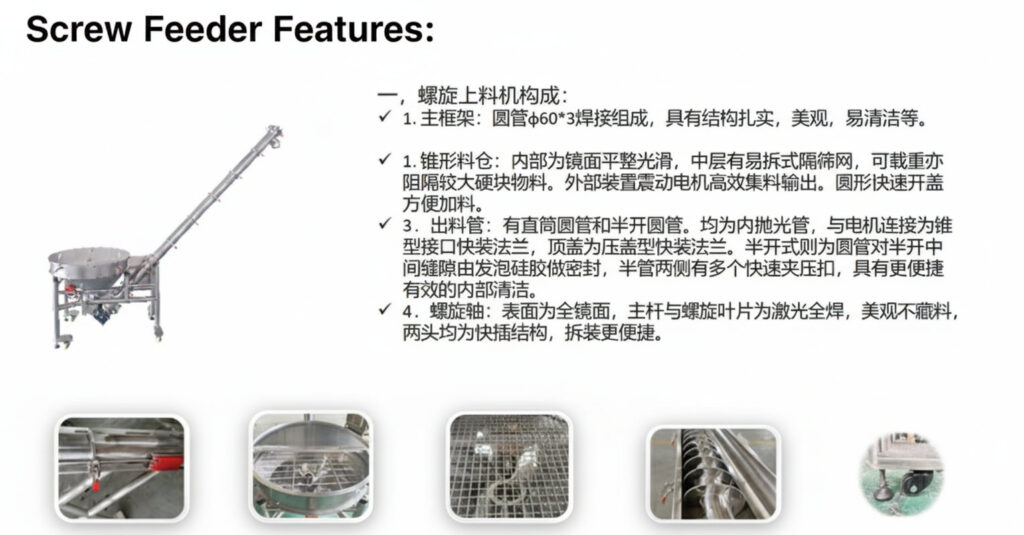 | English | Screw Feeder Structure: Main Frame: φ60*3 round tube welded structure, sturdy, aesthetic, easy to clean. Conical Hopper: Mirror-polished interior, detachable screen for blocking large materials, vibrating motor for efficient discharge, quick-opening cover. Discharge Tube: Straight tube + half-open round tube, quick-release clamps, foamed silicone pad for sealing, easy internal cleaning. Screw Shaft: Mirror-polished, laser-welded flights, quick-disassembly ends for cleaning, no residual material. |