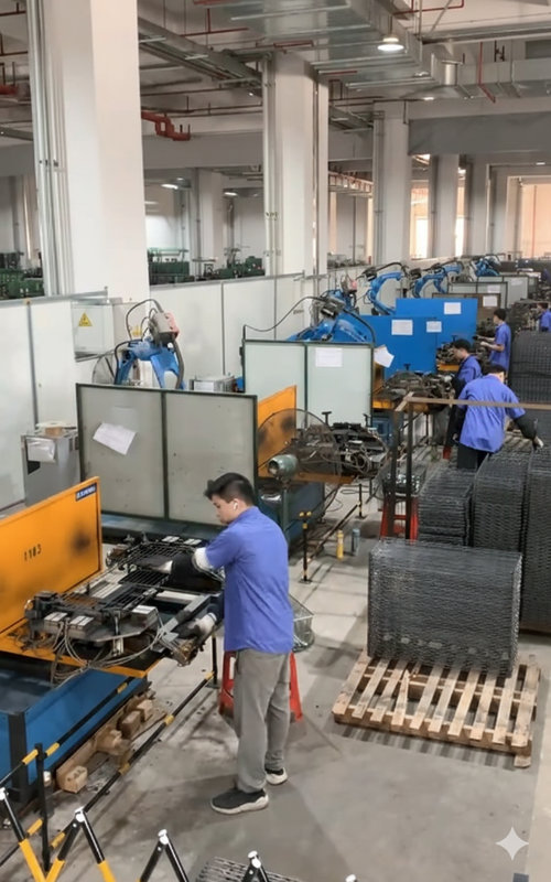 从图片可以看到,这是中山鑫捷金属有限公司正在运行中的点焊机械手生产线。多台焊接机械手同步作业,工人主要负责上料、下料及过程巡检,焊接动作由设备自动完成,现场节奏紧凑而有序。