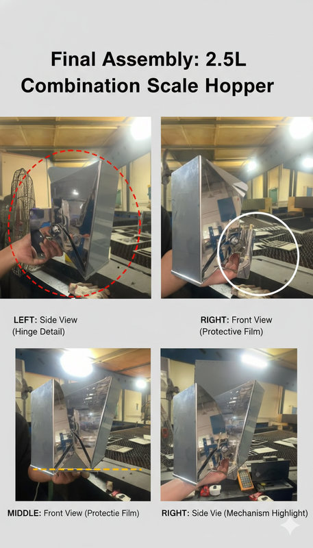| 项目背景 | 2026 年初,中山鑫捷成功为德国某知名食品包装机械巨头交付了 500 套 2.5 升组合秤料斗。该项目通过了极其严苛的德国工业标准检测,包含食品级安全测试及微米级的尺寸公差验证。 |