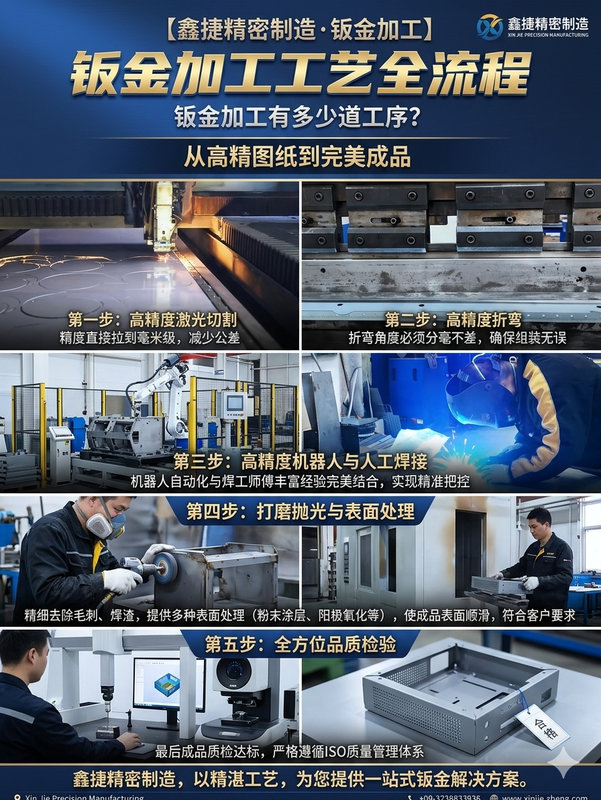 (精密钣金加工完整流程指南)钣金加工(Sheet Metal Fabrication)是将金属板材(厚度通常0.5-12mm)通过冷加工工艺转化为功能性零件的过程,如设备外壳、支架、食品机械配件等。工序数量并非固定——简单件可能只需3-5道,复杂非标件(如多弯曲+焊接+表面处理的自动化部件)常达8-12道,甚至更多。核心取决于材料(不锈钢、碳钢、铝合金)、厚度、精度要求(公差±0.1mm vs ±0.5mm)和批量。行业主流分类可概括为五大阶段:设计准备 → 切割下料 → 成型加工 → 连接组装 → 精加工&检验。以下基于中山鑫捷金属有限公司10+年精密钣金生产经验,拆解典型流程(以食品级不锈钢外壳为例),并标注每步关键参数、常见问题及解决方案。1. 图纸审核与DFM(Design for Manufacturability)优化(准备阶段,1道隐形工序)